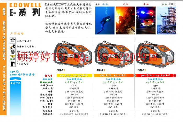 供应空气呼吸器充气泵,ECOWELL呼吸空气压缩机,空气充填泵产品说明:E13/16/18I-P2呼吸空气压缩机是一款电源为三相马达驱动的空气呼吸器填充泵,是所有同类机器中充气速度*快的一款。机器采用三缸三级压缩,三级过滤的框架式结构,具有压缩效率高、安全可靠性高等特点。压缩机带有轮式结构,移动方便,随时随地为你储备制造清洁的高压空气。可用于消防、潜水、武警、船舶、射击。