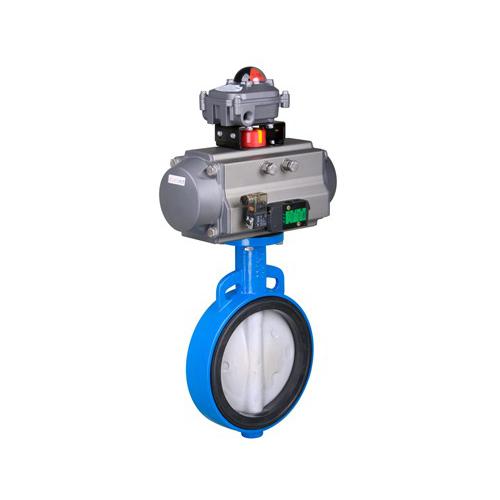 产品特点:气动式蝶阀,是在引进国外先进技术的基础上进行特殊设计,精心制造的产品。蝶阀配行程限位开关、电磁阀、三联件及0.4-0.7MPa气源可实现开关操作,并送出二对无源触点信号指示阀门的开关。采用智能控制与定位时,与国产电气阀门定位器配套,输入4-20mADC信号及0.4-0.7MPa气源即可实现智能控制,实现对压力、流量、温度、液位等参数的调节。它是以压缩空气为动力,阀杆带动阀芯在阀体内转动90℃,可以实现全开——全闭的动作。该产品按其密封性能分为金属密封与软密封。具有结构紧凑,体积精小,运行可靠,密封性好,维修容易,安装方便,适应性强等优点。可广泛应用于石油、化工、轻工、制药、造纸、汽车等工业自动控制系统中作远距离集中控制或就地控制。