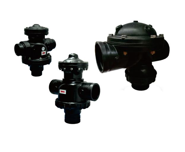 两位三通阀适用于各种介质过滤器、叠片过滤器、网状过滤器等的系统配套应用,隔膜驱动的阀塞可以在过滤器单元反洗时,首先关闭进水,然后采用过滤后水对过滤介质或过滤单元进行反冲洗并排走,实现了一阀多用的功能。阀门使用时由来自系统的水压或气压源来控制开闭,通过有至少三个通路的电磁阀、分配器或手动先导阀等来的控制信号实现阀门切换,这样就有两种状态:过滤状态和反洗状态。