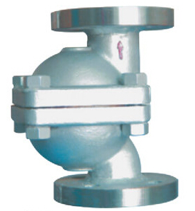 立式自由浮球式蒸汽疏水阀的结构简单,内部只有一个精细研磨的不锈钢空心浮球,既是浮子又是启闭件,无易损零件,使用寿命很长。装置刚起动时,管道内出现空气和低温冷凝水,双金属自动排空气元件把浮球推离阀座,阀门打开,排除不凝结气体,低温冷凝水流进疏水阀,浮球上升,凝结水迅速排放。装置很快提升温度,管道内温度上升到饱和温度之前,双金属自动排空气元件感温变型伸直;蒸汽疏水阀进入正常运行状况,浮球随液位升降调节阀孔流量;当凝结水停止进入时,浮球随介质流向逼近阀座,关闭阀门。立式自由浮球式蒸汽疏水阀的阀座总处于液位以下,形成水封,无蒸汽泄漏。