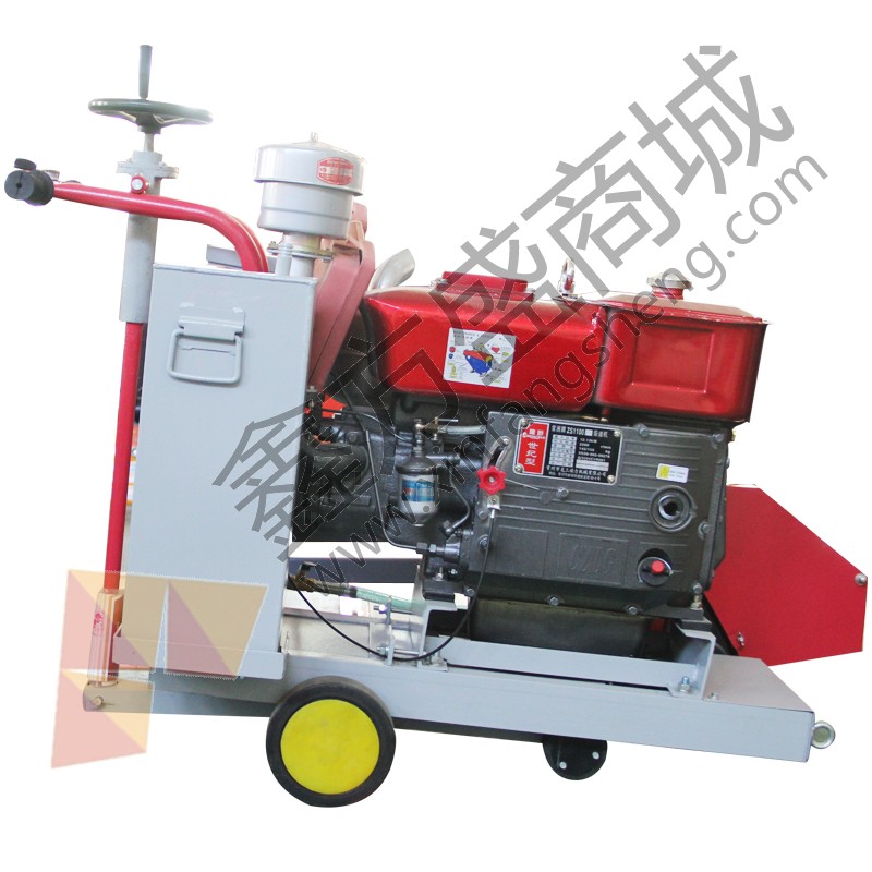 商品结构水箱、升降杆、机架、大行走轮、阀门、水管、小行走轮,发动机座、三角带、主轴皮带轮、锯片、锯片罩、导向杆、导向轮、发动机、扶手、升降架、手轮、油门,该机采用手推式行走切割前进,机头主轴上安装有金刚石锯片,机头由柴油机通过三角带带动,扶手前端安装有可调节切割深度的手轮,转动手轮使前轮升降,锯片随之升高或下降,机身后部有盛水的水箱,在切割时对锯片起到冷却的作用。