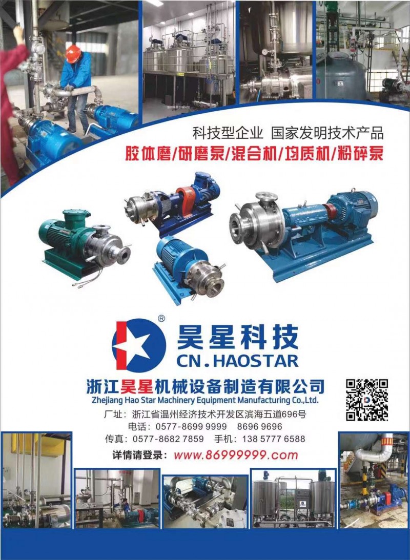 温州昊星机械设备制造有限公司CN.HAOSTAR®技术部门人员充分利用自主创新和发明科学技术各方面的优势, 2011年3月《管线式多功能研磨机》获得科技发展项目立项,2013年8月《钛白用微细连续研磨机》、获得浙江省科学技术厅科技成果、纳米级研磨泵、智能型低温胶体磨填补了国内外空白.高科技项目经过我公司的研制转换产业批量生产,新型管线式胶体磨、钛白炭黑多功能研磨机(高速胶体均化机)、胶体打浆泵、管道磨、纳米级研磨泵、##混合机、乳化器、石墨烯纳米分散研磨机、白酒糟粉碎机等新产品。