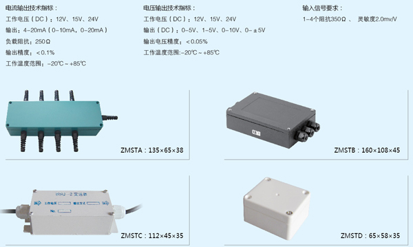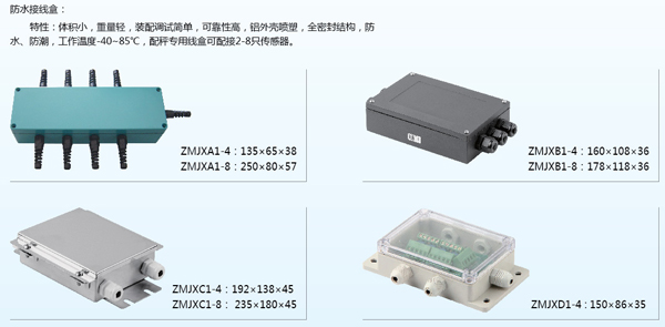特性:体积小、重量轻,装配调试简单,可靠性高,铝外壳喷塑,全密封结构,防水、防潮、工作温度-40~85℃,配秤专用线盒可配接2-8只传感器。