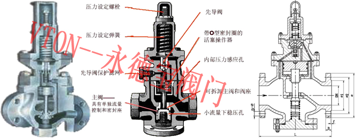 进口活塞式蒸汽减压阀,Piston type steam reducing valve,由主阀和导阀两部分组成。主阀主要由阀座、主阀盘、活塞、弹簧等零件组成。导阀主要由阀座、阀瓣、膜片、弹簧、调节弹簧等零件组成。通过调节调节弹簧压力设定出口压力、利用膜片传感出口压力变化,通过导阀启闭驱动活塞调节主阀节流部位过流面积的大小,实现减压稳压功能进口活塞式蒸汽减压阀主要用于蒸汽管路。