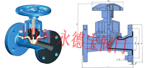 4、衬胶隔膜阀阀体与盖被中间隔膜开,使得隔膜上方的阀盖,阀杆等到零件不受介质侵蚀;