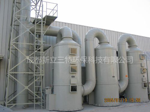 废气净化塔为我公司产品,公司已形成以填料式洗涤塔、旋流塔、动力波洗涤塔、光氧化洗涤塔、一体化洗涤塔等品类齐全的废气净化设备,可适应各种腐蚀环境、各种废气类型的高技术含量产品,是根据电镀和机加工表面处理工艺产生的污染性酸碱气体而设计的成套设备,也是我厂根据国内外废气处理设备和我厂多年酸雾处理经验的基础上改进的新一代废气处理设备本设备可根据废气特点进行组合安装,该设备具有阻力小,能耗省,噪声低,处理效率高。同时,根据我公司特有工艺运行可处理可挥发性VOCs有机废气、恶臭气体等非水溶性废气的处理,废气由风机压入净化塔内筒匀压室,经过一级喷雾处理,塔体上部喷淋吸收液,下部进入塔体的有害气体与喷淋液呈逆向流动喷淋液由上而下喷淋,这样能使汽液接触更加充分,采用重叠式双层滤料层喷淋及喷雾交叉布置,废气穿过有花片球式填料组成的填料层,再经过二道喷雾处理,使气液两相充分接触发生吸收中和反应,提高了净化效率,经处理后的废气再经过脱水器脱液处理,然后排入大气,达到高效净化之目的,净化后的废气达到环保排放标准。目前生产的 STPF(A/B/S/W/G)系列废气净化塔均为国内较新科研成果,该设备采用耐腐蚀玻璃钢机械缠绕成型或PP材料焊接成型,设备具有净化效率好,结构紧凑,造型美观,操作、维护方便,运行费用低等优点。产品投放市场后,经几年使用净化效率好,深受用户好评。