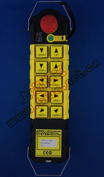 阿波罗工业无线遥控器,产品已率先通过IS09001体系认证,并以其良好的质量、合理的设计、优质的服务在国际遥控器行业中处于###地位,通过欧共体的CE、美国的FCC、劳动部安全检测技术中心检验认证许可。可在-25—+85度的环境中使用,外壳防水、防油,强度可达IP67。遥控距离100米,可穿透玻璃等障碍物。操作简单方便,性能安全可靠,外观小巧简洁,适用于单梁、双梁桥式或门式起重机、双小车式等多功能起重机各种特殊、非标工矿机械设备,阿波罗工业无线遥控器系列实用、可靠、灵活。广泛应用于各种人为操控不方便、不允许线控的场合,或想提高工作效率的企业。控制按键标准为单/双速2-14点,同时还可根据用户需求订制各种非标产品。