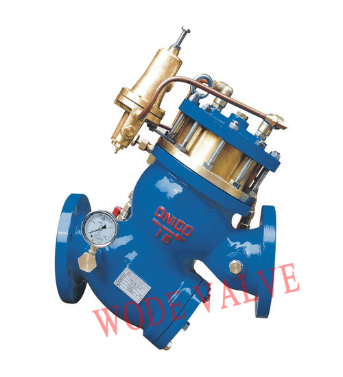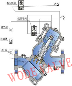 当管网压力超过安全值时,高压导阀立即开启与大气相通,主阀开时开启泄水降压,当压力恢复到正常状态后,导阀和主阀逐步关闭。
