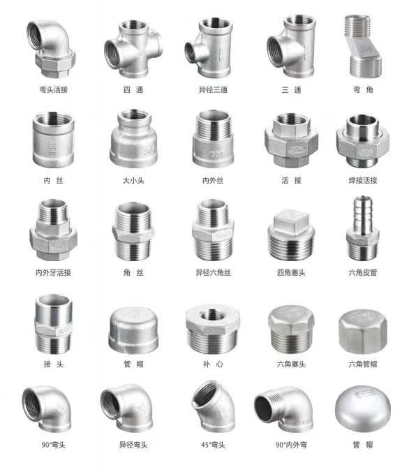 (弯头、三通、四通、大小头、管帽、双头丝,皮管接头、内外丝接头等)、丝扣阀门(球阀、闸阀、截止阀、止回阀)、三角阀、过滤器等。产品广泛应用于食品、乳品、啤酒、饮料、制药、化工、水处理、生物工程等领域。产品广泛采用国标(GB)机械部标准(JB)化工部标准(HG),美标(NSI)日本标准(JIS)德国标准(DIS)等国内标准及非标准产品,产品主要使用材质不锈钢304、316等