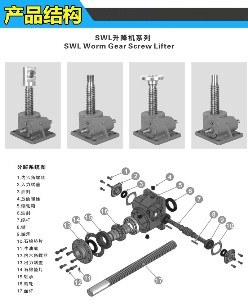 丝杆升降机,SWL系列蜗轮丝杠升降机是一种基础起重部件,符合JB/T8809—1998(原JB/ZQ4391—86)标准。承载能力2.5—120T。具有结构紧凑、体积小、重量轻、动力源广泛、噪音小、安装方便、使用灵活、功能多、配套形式多、可靠性高、使用寿命长等优点。
