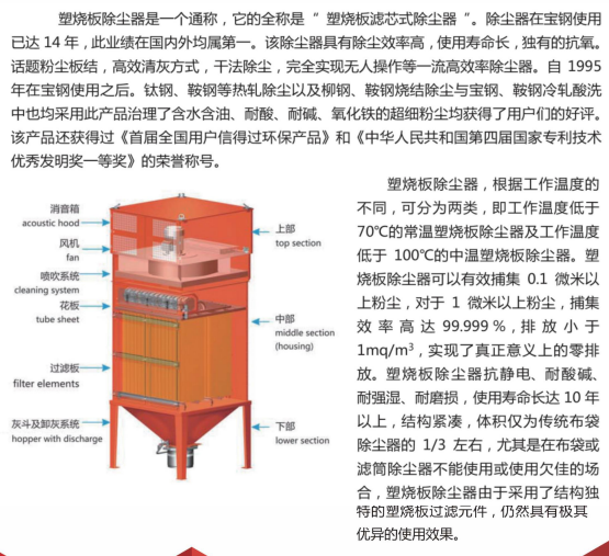 据已在使用塑烧板除尘器的宝钢、鞍钢等用户来看,在一般情况下,排气含尘浓度可控制在5mg/m3以下。在高浓度除尘系统中,除尘效率达99.999%。