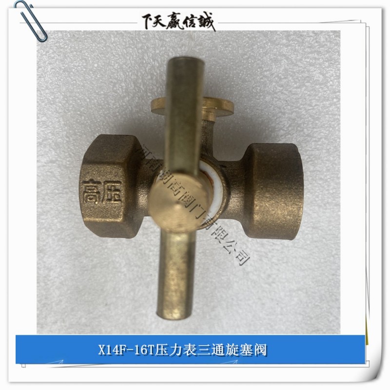 X14F全铜压力表三通旋塞阀,全铜压力表旋塞阀,锅炉铜考克,三通考克,高压压力表三通旋塞阀,高压铜旋塞阀,带排气孔铜考克,G1/2xM20x1.5压力专用表旋塞阀, G1/2xG1/2全铜旋塞阀,铜三通旋转阀,压力表三通阀,三通旋塞排气阀,带排气孔旋塞阀,铜压力表旋塞阀是柱塞形的旋转阀主要用于连接压力表,底部采用可简易调整的螺帽锁紧结构,用于机械,工地,化工安装,接铜,铁,不锈钢缓冲管和压力表专用。一头4分连接管道另一头M20×1.5连接压力表,也可以选择内丝4分×内丝4分由于它能够对阀位进行快速准确的判断,对压力表的测量准确度进行在线判断,对压力表进行在线校验,压力表在线拆除时阀门自动关闭,对压力表的取压信号进行缓冲及降温。压力表与存水弯管之间,装有三通旋塞,它是用来冲洗存水弯管,水压试验用表与工作压力表的切换,装接标准压力表与工作压力表的校验,同时也是装卸压力表不可少的重要附件.旋塞密封面之间运动带有擦拭作用,而在全开时可完全防止与流动介质的接触,故它通常也能用于带悬浮颗粒的介质。通过旋转90度使阀塞上的通道口与阀体上的通道口相同或分开,实现开启或关闭的一种阀门。旋塞阀的阀塞的形状可成圆柱形或圆锥形。在圆柱形阀塞中,通道一般成矩形;而在锥形阀塞中,通道成梯形。这些形状使旋塞阀的结构变得轻巧,但同时也产生了一定的损失。旋塞阀适于作为切断和接通介质以及分流适用,但是依据适用的性质和密封面的耐冲蚀性,有时也可用于节流。由于旋塞阀密封面之间运动带有擦拭作用,而在全开时可完全防止与流动介质的接触,故它通常也能用于带悬浮颗粒的介质。旋塞阀的另一个重要特性是它易于适应多通道结构,以致一个阀可以获得两个、三个,甚至四个不同的流道。这样可以简化管道系统的设计、减少阀门用量以及设备中需要的一些连接配件。压力表前加旋塞阀作为切断和接通介质以及分流适用。压力表旋塞阀主要是用在测量管路上与压力表配套使用。小型无填料的旋塞阀又称为“考克"。旋塞阀的塞体多为圆锥体(也有圆柱体),与阀体的圆锥孔面配合组成密封副。旋塞阀结构简单、开关迅速、流体阻力小。普通旋塞阀靠精加工的金属塞体与阀体间的直接接触来密封,所以密封性较差,启闭力大,容易磨损,通常只能用于低(不高于1兆帕)和口径(小于100毫米)的场合。压力表旋塞阀广泛地应用于油田开采、输送和精练设备中的压力表配套,安装在锅炉上的压力表,必须使用压力表三通旋塞阀才能使锅筒、蒸气及空间相连通以便进行冲洗存水弯管,校对、更换压力表等工作。广泛用于热力、电厂、自来水、城建、市政、石油、石化、新能源、造纸、采矿、燃气、化工、制药、真空、冶金、冶炼、自动化、食品、油气回收、水处理、暖通、楼宇自控等领域以及一般工业中配套压力表测量使用。