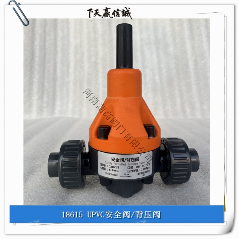 18615UPVC背压阀,安全阀,泄压阀,18620背压阀,18625背压阀,18632背压阀,18640背压阀,18650背压阀,18665背压阀,塑料安全阀,塑料背压阀由隔膜、阀芯由内部弹簧压紧顶住阀座,当系统管路内压力超过预设定的压力时,隔膜、阀芯被顶起,介质泄出至回流管及容器,由于阀的功能而形成一定的压力,压力一般可以调节。可用于控制空气、水、蒸汽、各种腐蚀性介质、泥浆、油品、液态金属和放射性介质等各种类型流体的流动。启闭件是一个圆盘形的阀板,在阀体内绕其自身的轴线旋转,从而达到启闭或调节的目的。在管道上主要起切断和节流作用。背压阀在系统中起保护作用。当系统压力超过规定值时,阀打开,将系统中的一部分气体/流体排入大气/管道外,使系统压力不超过允许值,从而保证系统不因压力过高而发生事故。在现场可通过调节螺丝借助管路中的压力表在0-1.0Mpa范围内设置压力,泄放压力一般设置高于系统压力0.1-0.2Mpa,安全阀调压不允许超过计量泵的最压力,安装一般尽量靠近泵的出口处,泵与安全阀之间不应有任何阀门。保护泵的安全和系统的正常运行。当流体从背压阀进口进入,被膜片阻挡,于是流体对膜片产生向上的压力。当压力足够大时,弹簧被压缩,流体顶起膜片形成通道,从背压阀出口流出;若流体压力不够,就会形成憋压,使进口压力上升直到达到额定压力,顶起膜片形成通路。背压阀的额定压力可调节,一般通过调节弹簧上端的顶杆,从而调节弹簧的长度来实现。安全阀设置范围:0.03-1.0Mpa。