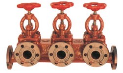 船舶系统中常有很多分支管路,为了简化控制和管理方便,常将几个阀并置而成一个阀箱,这在舱底系统中较为常见。图为普通的具有截止一止回阀门的三阀阀箱,这种阀箱由一根干管连接几个支管,能同时由各支管将液体吸入干管或个别吸入,当所有阀门关闭时,液体沿干管流动。