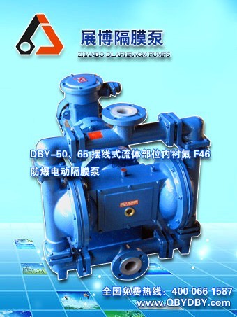 新研制开发的DBY-50-65摆线式流体部位内衬氟防爆电动隔膜泵,采用XLD系列摆线针轮减速机传动动力,电动隔膜泵是一种新型的泵类,近年来,由于在隔膜材质上取得了突破性的进展,国际上越来越多的工业化国家采用此种型式的泵,取代部份离心泵、螺杆泵,来应用于石化、陶瓷、冶金等行业,产品设计均参考美国ABEL公司样机,该泵适用于低压,即出口压力≤3kgf/cm2的场合。