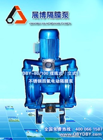 新研制开发的DBY-80-100摆线式(立式)不锈钢四氟电动隔膜泵,采用XLD系列摆线针轮减速机传动动力,电动隔膜泵是一种新型的泵类,近年来,由于在隔膜材质上取得了突破性的进展,国际上越来越多的工业化国家采用此种型式的泵,取代部份离心泵、螺杆泵,来应用于石化、陶瓷、冶金等行业,产品设计均参考美国ABEL公司样机,该泵适用于低压,即出口压力≤3kgf/cm2的场合。