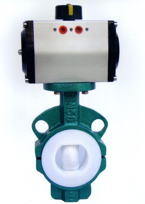 气动衬氟蝶阀是用阀杆一起转动的蝶板作启闭件,用以实现阀门的开启,关闭与调节。气动衬氟蝶阀是在过流部件、阀体、蝶板、阀杆上采用衬里技术衬里较厚的高分子材料,防腐蚀性能优良,可适用于任何浓度的酸、碱、盐及氧化剂、还原剂、有机溶剂等介质,是化工、石油、医药、食品、钢铁冶炼、造纸、水电等系统的气体、液体、半流体的管路和容器上作截流和调节设备使用的理想产品,并可取代闸阀、截止阀和其它类型的切断、调节阀门。
