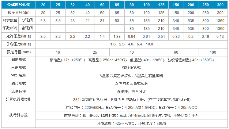 川羽公司生产的电动三通调节阀,是由PSL系列和3810系列直行程电动执行机构和三通调节阀体组成。(也可配其它品牌直行程执行机构)。电动执行机构为电子式一体化结构,内有伺服放大器,输入控制信号(4-20mADC或1-5VDC)及电源即可控制阀门开度,达到对压力、流量、液位、温度等工参数的调节。电动三通调节阀具有动作灵敏、连线简单、流量大、体积小、调节精度高等特点。控制精度和性能比DKZ型有明显提高。电动三通调节阀具有调节精度高,动作稳定可靠等优点。电动三通合流调节阀主要用于将两种流体混合成第三种流体;电动三通分流调节阀主要用于将一股流体分成两股流体。电动三通调节阀产品可代替两台互为开关的单、双座调节阀,用于液体、气体、蒸汽等介质的调节与控制。