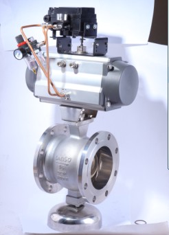 气动V型球阀是我公司新开发的硬密封、四氟密封调节球阀。它采用板簧加载的可动阀座结构,阀座与球体不会产生卡阻或脱离等问题,密封可靠,使用寿命长。V型球阀阀芯设计成带有特殊开关的V型缺口,流通能力大,压力损失小,并具有精确的截流特性和控制功能,流量特性为近似等百分比。启闭件采用V型球缺结构,完全解决了阀腔易沉积介质的问题。
