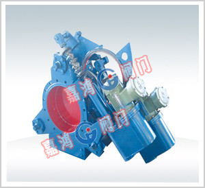 液动扇形盲板阀主要由左阀体、右阀体、丝杆副、翻板、密封圈、杠杆、液压油缸等零件组成,并由底座、支撑柱构成一个刚性结构体。阀门中设有夹紧油缸和翻板油缸,夹紧油缸通过杠杆副和丝杠螺旋副驱动左、右阀体完成松开、夹紧动作,翻板油缸驱动翻板完成开关动作。橡胶密封圈镶嵌在翻板上,具有耐高温、密封性能好、更换方便、使用寿命长等特点。