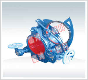 该阀门由左阀体、中阀体、右阀体、扇形盲板、丝杆螺母付、不锈钢补偿器、两个蜗轮传动机构等组成。它是通过三根丝杆连成一体,并把三个阀体分别固定在底座上,构成一个刚性结构体。中阀体与右阀体用不锈钢膨胀管联接,左、中阀体分别用三根两端带左右梯形螺纹的丝杆联接,将三根丝杆同时作正向(或反向)旋转,则左、中两阀体得到压紧(或分离)。三根丝杠中上面一根丝杆中间装有盲板,盲板绕该轴心旋转。下面两根丝杠在同样的部位上安装有盲板的定位块,盲板旋转时可以防止盲板漂移,避免密封胶圈擦伤。其中一根上装有蜗轮传动机构,实现松开夹紧阀体的目的。