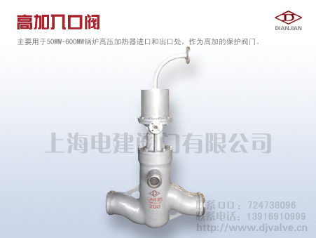 高加给水加热器用进口阀(入口阀)、出口阀(出口止回阀)系列产品分别用于50MW-600MW锅炉高压加热器进口和出口处,作为高加的保护阀门。高加运行过程中,当发生管系泄漏或疏水阀失灵等情况时会导致汽侧水位升高,易造成高压给水倒灌入汽轮机。为防止事故发生,当汽侧水位达到报警水位时,电接点水位发讯器接点接通,快速启闭电磁阀打开,凝结水进入进口阀活塞上方,进口阀瓣关闭,切断进口高加的给水,同时旁路打开,给水经旁路进入锅炉,高加解列,从而保证机组正常运行。高加投入时,进口阀阀瓣在系统内给水压力作用下自动开启并切断旁路,给水经过高压加热器后进入锅炉,从而提高电厂的热效率并保证机组安全运行。
