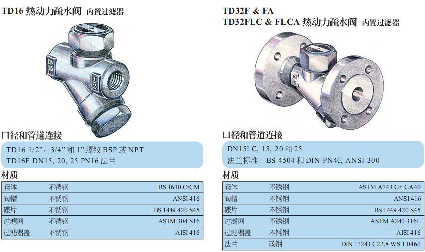 斯派莎克SpiraxSarco疏水阀:热动力疏水阀结合了安全可靠、结构简单和效率高的特点,其*大工作压力可达120bar g。斯派莎克SpiraxSarco疏水阀:TD热动力疏水阀系列的用户遍及全世界的原因在于以下各项特点:1、本体结构结实、简单、重量轻、操作压力范围大。2、只有一个活动部件、一个硬化的不锈钢蝶片,具有很长的使用寿命。同时可具止回阀的功能。3、间歇喷放排水及迅速紧密的关闭,保证无泄漏。4、可承受过热、水锤、冷冻、腐蚀性冷凝水。蝶片落入阀座时发出“喀嚓”声,便于检测工作性能。5、在任何安装位置下均能正常工作。6、有各种不同的型号,可选择螺纹、法兰、焊接等连接方式。
