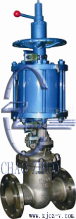 4、气缸盖上部装有气动-手动转换装置。将转换手柄顺时针方向提转到“气动”定位孔定位,闸阀处于气动操作状态;反之,将转换手柄逆时针方向提转到“手动”定于孔处定位,闸阀即可进行手动操作。带锥齿轮的手柄转换方向相反。手动操作闸阀时,手轮旋向和普通手动阀一样,即顺时针转为关,逆时针转为开。带锥齿轮转动的相反。