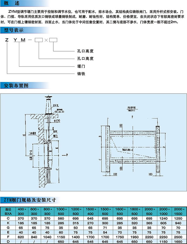 ZYM型调节堰门主要用于控制和调节水位,也可用于配水、排水场合,其结构类似铸铁闸门,采用升杆式安装。门体、门框、导轨采用优质灰铸铁或球墨铸铁制成,耐磨、耐腐蚀性好,结构简单,价格便宜,在关闭状态下有较高密封要求时,可在门框上镶铜密封面,四面止水,当门体处于中间任意位置时,其两侧与底部不渗水,门体宽度一般不超过2M。