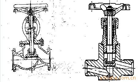 1)、直通式截止阀:介质的进出口两个通道在同一方向上,呈180°,如图2-8所示。这种形式的截止阀,使流动状态的破损程度相对比较小,因此,通过该阀的压力损失也相应地减小了。