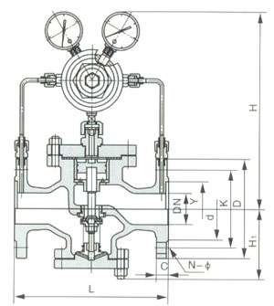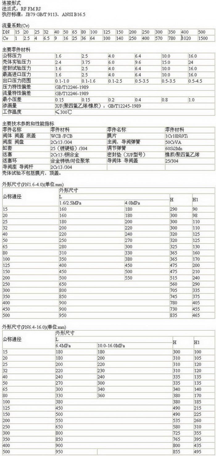 本系列减压阀属于先导活塞式减压阀。由主阀和导阀两部分组成。主阀主要由阀座、主阀盘、活塞、缸套、弹簧等零件组成。导阀主要由阀座、阀瓣、膜片、弹簧、调节弹簧等零件组成。通过调节弹簧压力设定出口压力,利用膜片传感出口压力变化,通过导阀启闭驱动活塞调节主阀节流部位过流面积的大小,实现减压稳压功能。