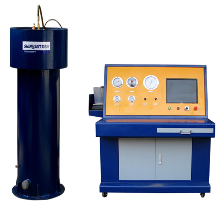 气瓶外测法水压测试机主要用于对受试气瓶进行耐压试验同时获得受试瓶的容积残余变形率,采用计算机控制。其工作原理为:将受试瓶置于一个特制的水套内,采用高压泵对受试瓶进行增压,达设定压力后自动进入保压状态,对受试瓶进行耐压试验,与此同时,气瓶在试验压力下体积膨胀,把水套内的一部分水挤压到量杯中,这部分水量就是受试验瓶的容积变形量,通过水量采集系统传输至工控机中,气瓶卸压后,弹性变形消失,于是量杯中的水又返回至水套内,未返回的水量是受试瓶的容积残余变形量,通过水量采集系统传输至工控机,容积残余变形量与全变形量的百分比就是气瓶的容积残余变形率。