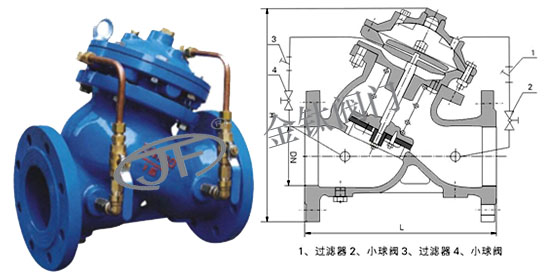 JD745X多功能水泵控制阀的结构特点,多功能水泵控制阀由主阀和调节阀接管组成,阀体采用直流式阀体,主阀控制室为膜片和活塞式的双控制室结构,控制室比一般水力控制阀增加了一个,增加了对主控室的功能,实现了对书泵出口缓慢开启,全开、缓闭、截止等多功能控制,实现了一个阀门,一次性调节对水泵出口的多功能控制。