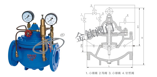 当主阀出口压力低于导阀设定的压力时,导阀此时处于开通状态,主阀上腔压力与主阀出口压力相等,进口与吃口存在压差,水流经阀口出口流出,当消防泵气泵时,或变平泵压力升高时,超过导阀设定压力,由主阀进口向导阀管控制室压力升高,作用在弹簧压力增大,向下压紧,带动阀芯下移,使导阀关闭,此时主阀进口压力通过节流阀补充到主阀阀盖上腔,因阀瓣受到向下压力大于向上推力,主阀关闭