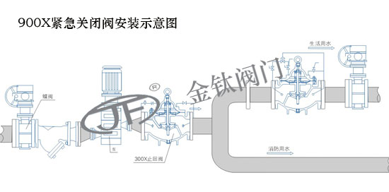 900X紧急关闭阀,是一种用于消防用水与生活用水并联的供水系统中,用来调配水方向的阀门,当火灾发生时,消防急需大量用水,900X紧急关闭阀立即切断生活用水,确保主够的消防用水,当消防停止用水,压力减小时,阀门自动打开,呈现常开状态,恢复生活供水。该阀使系统无需另设专门的消防单独供水管网,大大节约了建设成本和用水量。阀门控制灵敏度高,安全可靠,调试简便,使用寿命长。