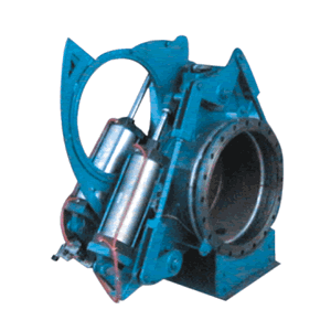 工作原理:用松开、夹紧汽缸推动主摇臂驱动V字型摇臂从而使连杆机构驱动三根丝杠同时做正向(或反向)旋转,使左、右阀体松开(或夹紧);用翻板汽缸推动闸板转动达到闸板上盲孔和通孔的转换动作。阀门上装有显示动作位置的接近开关,可实现该阀门的远距离控制。