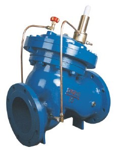 水力控制阀就是水压控制的阀门,是由一个主阀及其附设的导管,导阀,针阀,球阀及压力等组成。根据使用目的,功能及场所不同演变成水力控制阀等。水力控制阀分为隔膜型或活塞型两类,工作原理相同,都是以上游压力差△P为动力,使隔膜(活塞)液压式差动操作,完全由水力自动调节,从而使主阀阀盘完全开启或关闭处于调节状态,当进入隔膜(活塞)上腔控制室内压力水被排到大气和下游低区域时,作用在阀盘底部或隔膜下方的压力值大于上方压力值时,所以将阀盘推动完全开启开启位置,当进入隔膜(活塞)上腔控制室内压力水不能排到大气或下游低区域时,作用在隔膜(活塞)上方压力值大于下方压力值,所以就会把主阀盘压到完全关闭的位置,当隔膜(活塞)上腔控制室压力值处于入口压力和出口压力中间时,主阀盘就处于调节状态,其调节位置取决与导管中的针阀和可调导阀联合控制作用。可调导阀可以通过下游出口压力并随它的变化开大或关小其自身的小阀口,从而改变隔膜(活塞)上腔室的压力值,控制主阀阀盘调节位置。