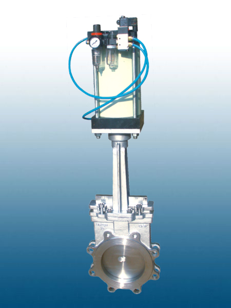 气动刀闸阀,就是在手动刀闸阀基础上加一个气动执行器,从而实现阀门的开和关。其可分为上下两部分,上半部分为气动执行器,下半部分为阀门。