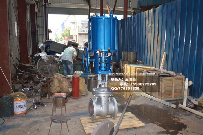 气动闸阀用途及使用范围气动带手动楔式闸阀是具有气动执行机构(双层气缸,并带有缓冲机构)和手动及其保护机构(手动和可自锁的气动-手动转换装置)的低支架明杆闸阀。该阀由于采用双层气缸结构,其与单气缸式气动闸阀相比,提升力增大了一倍。这就从根本上解决了单气缸气动闸阀的某些阀体内楔死而打不开的弊病。而且,由于该阀具备缓冲机构,能有效地减速轻了关闭阀门时,由于活塞下行冲击而造成的阀板车密封面和阀体密封面的磨损,同时,也能避免闸板卡死的现象。