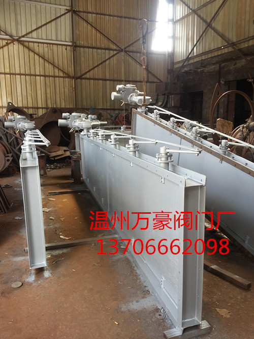 该阀由阀体、阀板、上阀杆、下阀杆、传动曲柄 、传动杆组成,阀板为多叶结构。方形阀门在关闭时每片阀板边缘之间约有10mm的重叠,阀板与阀体上焊接的阀座重叠。上阀杆头部设有传动曲柄,传动杆 将所有的传动曲柄连接在一起。阀杆部位设有轴承,减少了阀门本身的阻力,阀门在工作时开启迅速、操作力距小。