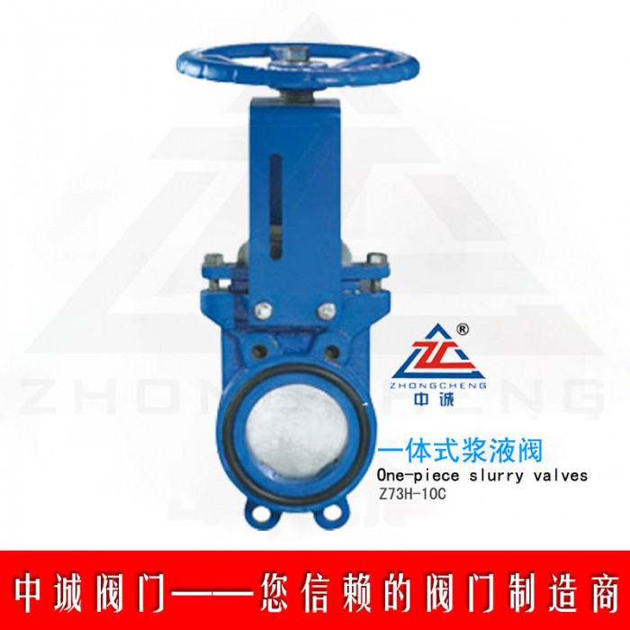 一种整体式浆液阀,包括阀体、阀杆和闸板,阀体的内壁嵌装有U型的弹性中空式密封条,闸板的边缘则和密封条接触密封配合,阀体是整体成型结构,且密封条的空腔中内置有弹性钢丝构成支撑加强结构。本实用新型采用整体成型的阀体,强度高,不易损坏,生产迅速。在密封条的空腔中置放有弹性钢丝,加强弹性,支撑可靠,装配嵌入阀体内壁中很方便,防止密封条变形泄漏,密封性能更好,充分保证了浆液阀的零泄漏,介质双向流动基本无流阻。